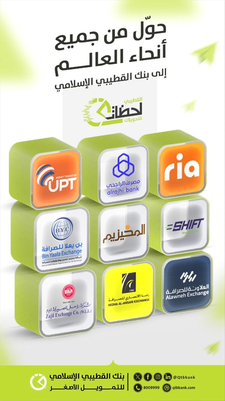 في إطار جهوده المستمرة لتوفير حلول مالية مبتكرة وسهلة، يعلن بنك القطيبي الإسلامي للتمويل الأصغر عن تقديم خدمات التحويل المالي من العديد من الدول العربية والعالمية، مما يتيح للعملاء استلام حوالاتهم بسرعة وأمان.
