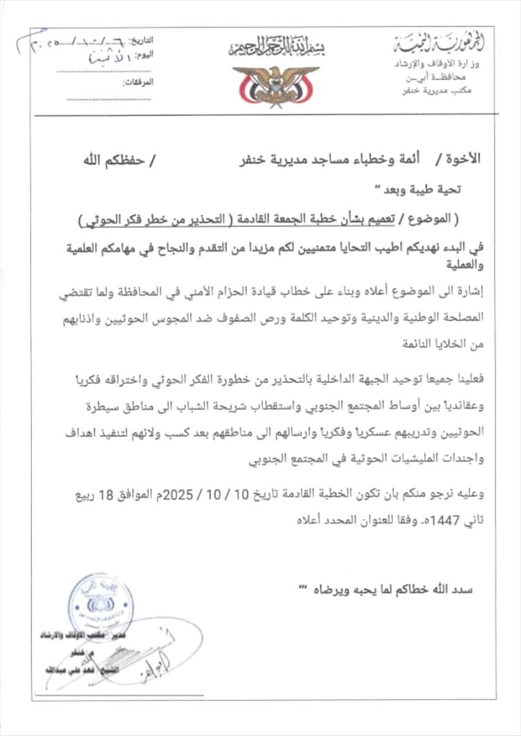 وجه مكتب الأوقاف بمديرية خنفر ممثلا بالشيخ فهد علي عبدالله مدير مكتب الأوقاف والإرشاد خنفر تعميمًا لأئمة وخطباء المساجد بالمديرية دعا فيه الالتزام بخطبة الجمعة القادمة بتاريخ 10 أكتوبر 2025م الموافق 18 ربيع ثاني 1447هـ بعنوان "التحذير من خطر فكر الحوثي".