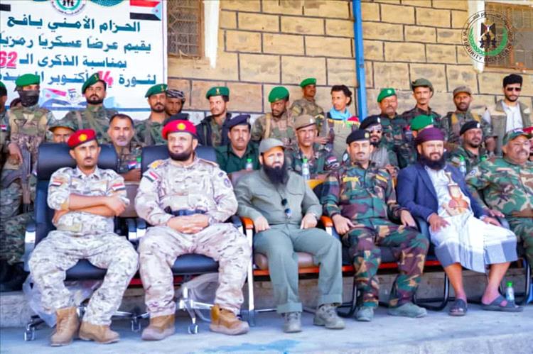 نظّمت قوات الحزام الأمني في يافع، صباح اليوم الخميس، عرضا عسكريا مهيبا لسرايا رمزية من قواتها، بحضور القائد العام لقوات الحزام الأمني، العميد محسن بن عبد الله الوالي، وذلك تزامنا مع الذكرى الثانية والستين لثورة الرابع عشر من أكتوبر المجيدة، التي انطلقت شرارتها الأولى من جبال ردفان الشماء.