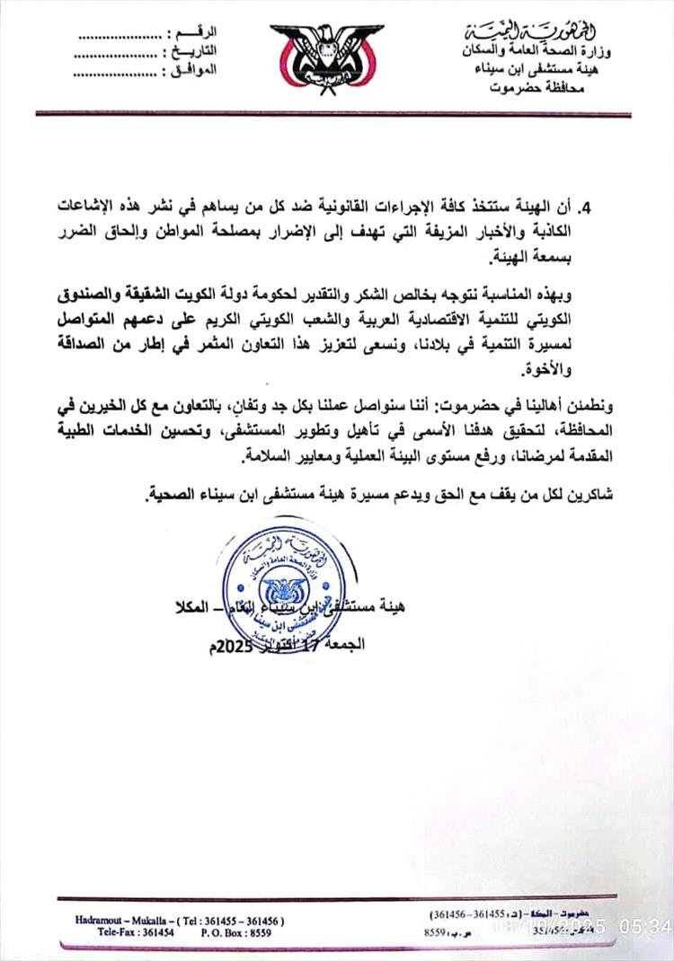 وفي ختام البيان، توجهت هيئة مستشفى ابن سيناء بخالص الشكر والتقدير لدولة الكويت الشقيقة، حكومةً وشعباً، على دعمهم المستمر للقطاع الصحي في حضرموت، مؤكدة أن هذا الدعم يجسد عمق العلاقات الأخوية بين البلدين الشقيقين، ويعكس حرص الصندوق الكويتي على المساهمة في تنمية البنية التحتية الصحية في اليمن.