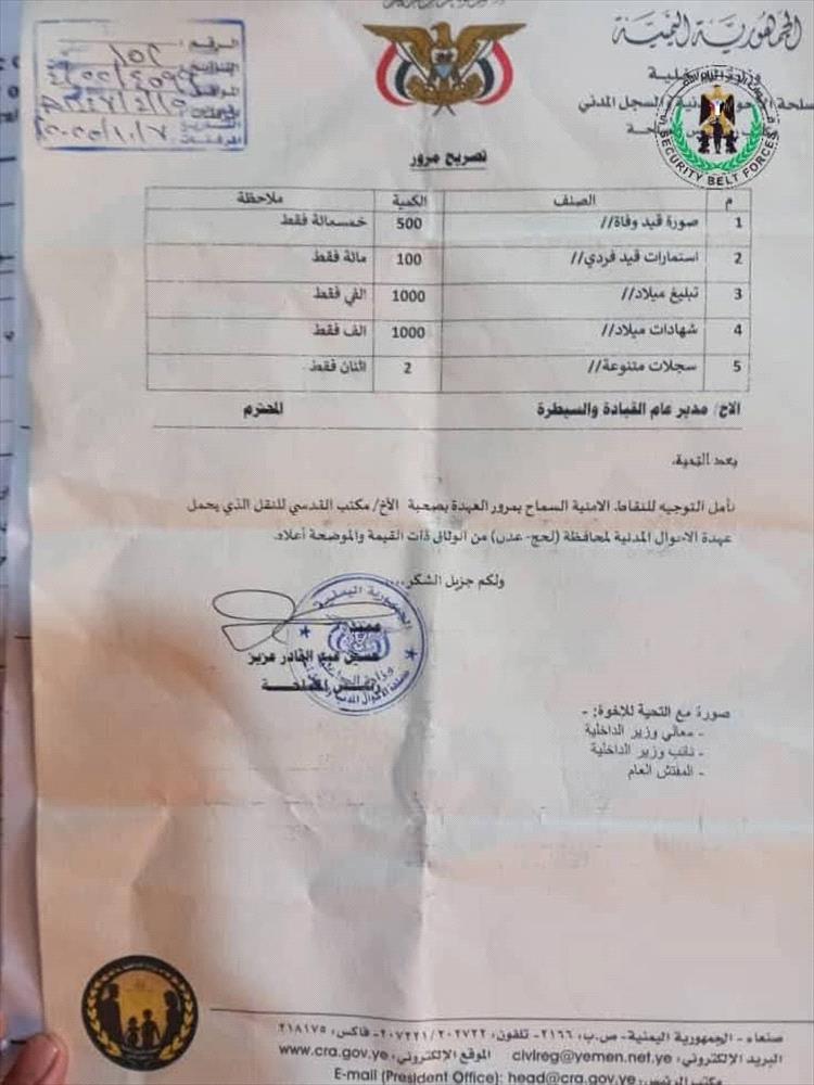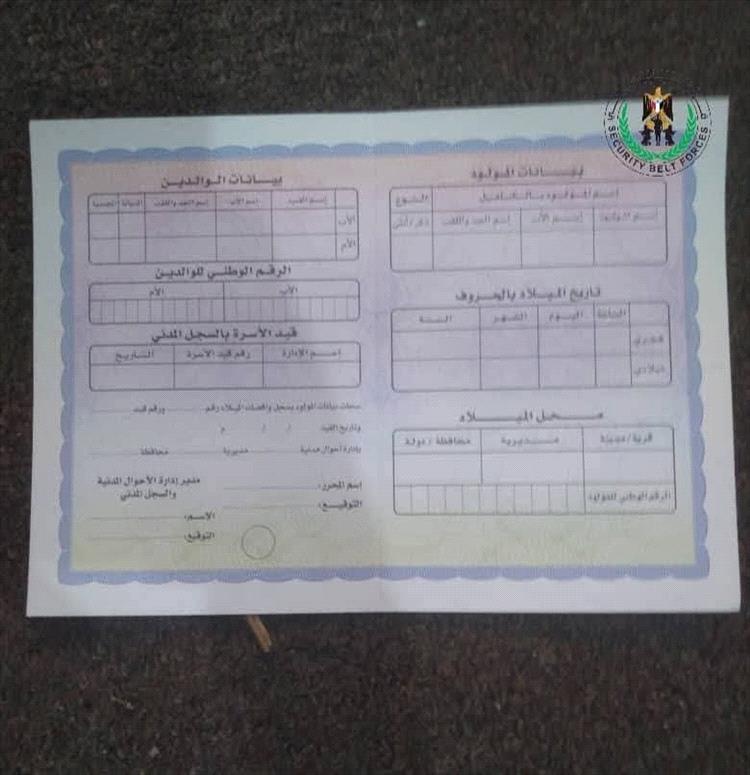 وأضاف المصدر أن المضبوطات شملت شهادات ميلاد، واستمارات قيد وفاة، وقيد فردي، وأوراق تأكيد سكن، وعددًا من الوثائق الأخرى، حيث جرى التحفظ عليها، ومن ثم إحالتها إلى القيادة العامة لقوات الحزام الأمني، التي قامت بدورها بتسليمها إلى مصلحة الأحوال المدنية بعدن لاستكمال الإجراءات والتحقيقات اللازمة لتحديد مصدرها والجهات المتورطة في محاولة تهريبها.