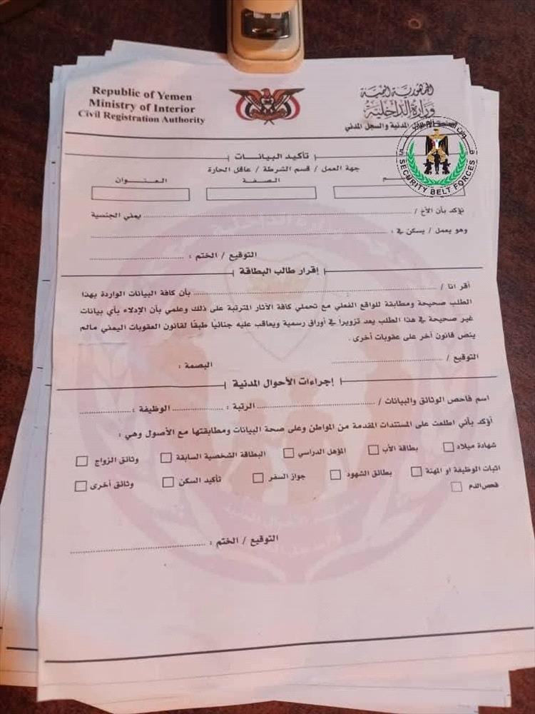 تمكنت قوات حزام طوق عدن من ضبط كمية من الأوراق الثبوتية غير القانونية كانت في طريقها إلى مناطق تقع تحت سيطرة الحكومة الشرعية، قادمة من مناطق خاضعة لسيطرة مليشيات الحوثي.