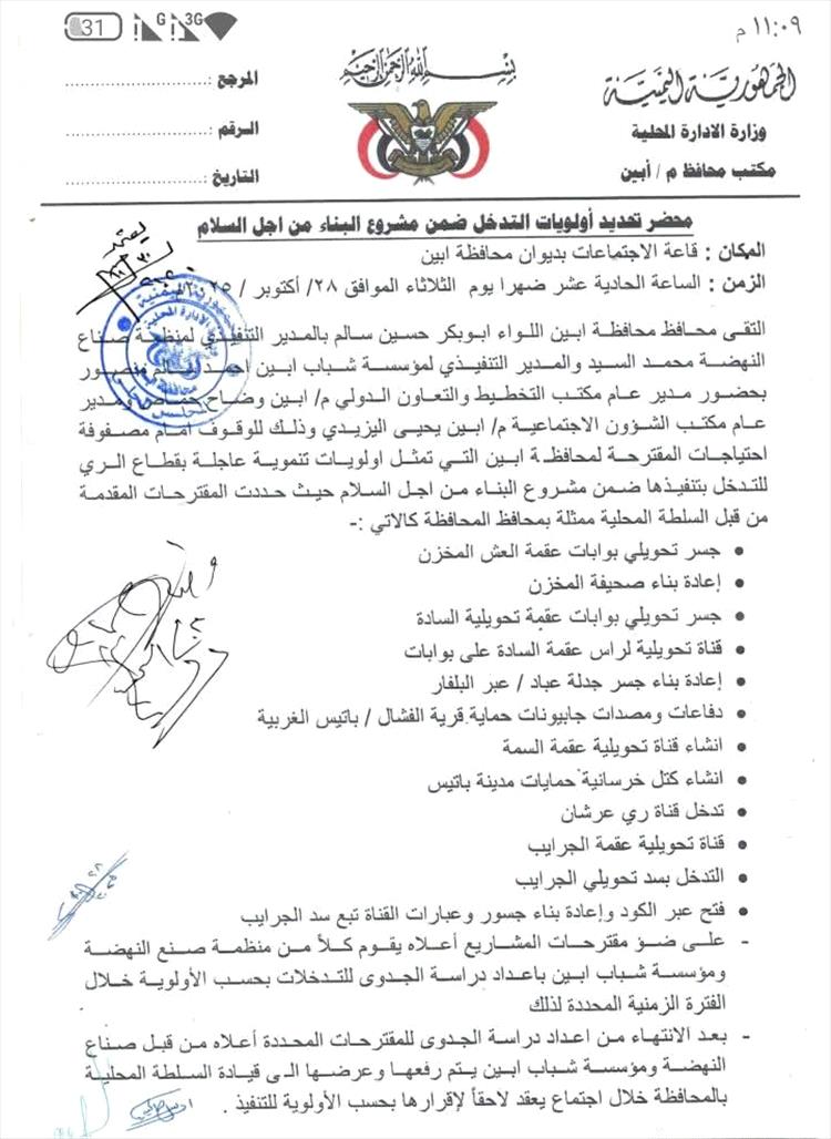 عقد محافظ محافظة أبين، اللواء أبوبكر حسين سالم، اجتماعًا هامًا يوم الثلاثاء الماضي، مع قيادات في منظمة صناع النهضة ومؤسسة شباب أبين، لتحديد الأولويات التنموية العاجلة في قطاع الري بالمحافظة، والتي ستُنفذ ضمن مشروع "البناء من أجل السلام".
