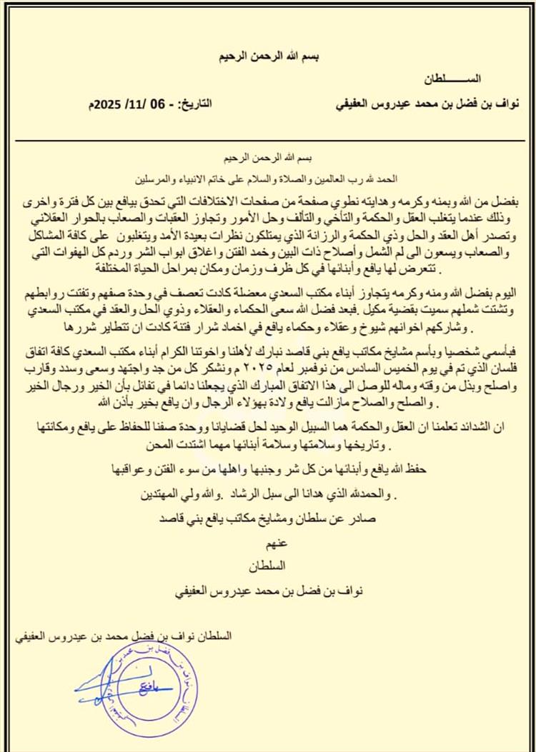 أعلن السلطان نواف بن فضل بن محمد عيدروس العفيفي باسم مشايخ مكاتب يافع بني قاصد عن طي صفحة الخلافات بين أبناء مكتب السعدي بعد جهود حثيثة بذلها الحكماء والعقلاء لإصلاح ذات البين والتوصل إلى اتفاق فلسان الذي تم يوم الخميس الموافق 6 نوفمبر 2025م مؤكدًا أن العقل والحكمة هما السبيل لحل القضايا وحفظ وحدة يافع وتماسكها.