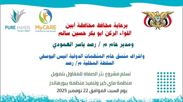 برعاية محافظ محافظة أبين، ومدير عام مديرية رصد، وبإشراف منسّق عام المنظمات المحلية والدولية في أبين الأستاذ أنيس اليوسفي، سلّمت السلطة المحلية في مديرية رصد اليوم موقع مشروع تأهيل بئر الصفاه للمقاول المنفّذ، تمهيدًا لبدء أعمال التنفيذ الفعلي للمشروع، بتمويل من المنظمة الماليزية وتنفيذ منظمة بيور هاندز الأمريكية.