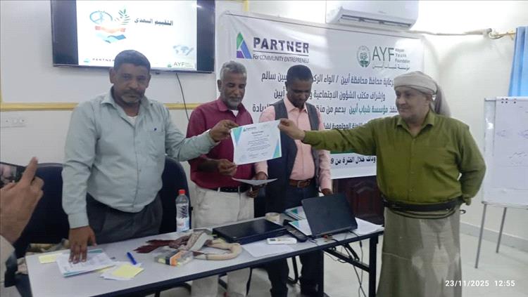 اختتمت مؤسسة شباب أبين AYF المؤسسة المجتمعية الرائدة في العمل التنموي والإنساني بمحافظة أبين ورشة العمل التدريبية الخاصة ببناء قدرات اللجنة المجتمعية المعنية بشؤون الناجين في مديرية خنفر والتي نظمتها خلال الفترة من 19 إلى 23 نوفمبر 2025 تحت رعاية محافظ محافظة أبين اللواء الركن أبوبكر حسين سالم وإشراف مكتب الشؤون الاجتماعية والعمل أبين وبدعم من منظمة شركاء من أجل الريادة Partner For Community Entrepreneur. جاءت الدورة كخطوة نوعية تعكس الاهتمام الكبير بالمجتمع المحلي حيث أسهمت في صقل مهارات المتدربين والمتدربات وتمكينهم من لعب دور فاعل داخل مجتمعاتهم إذ تلقوا خلال ثلاثة أيام حزمة واسعة من المهارات في مجالات حقوق الإنسان وبناء السلام والمناصرة قدمها المدربان المتميزان أحمد عبدالله أبو طيبة والأستاذ علاء باحكر بأسلوب تفاعلي عزز فهم المشاركين للقضايا الجوهرية التي تمس حياة النازحين والمجتمع.