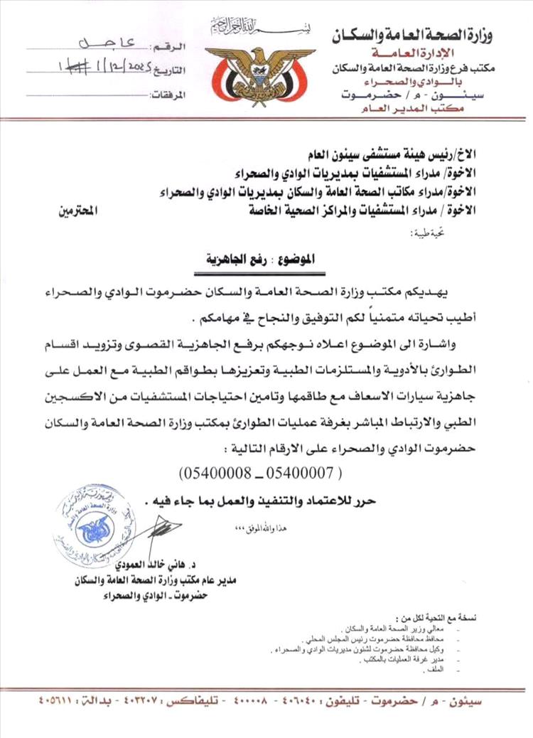 أصدر مكتب وزارة الصحة العامة والسكان بحضرموت الوادي والصحراء توجيهات عاجلة لكافة المستشفيات والأقسام الطبية بضرورة رفع الجاهزية القصوى لمواجهة الطوارئ الطبية، مع تزويد أقسام الطوارئ بالأدوية والمستلزمات الضرورية، وتعزيزها بالكفاءات الطبية المؤهلة.