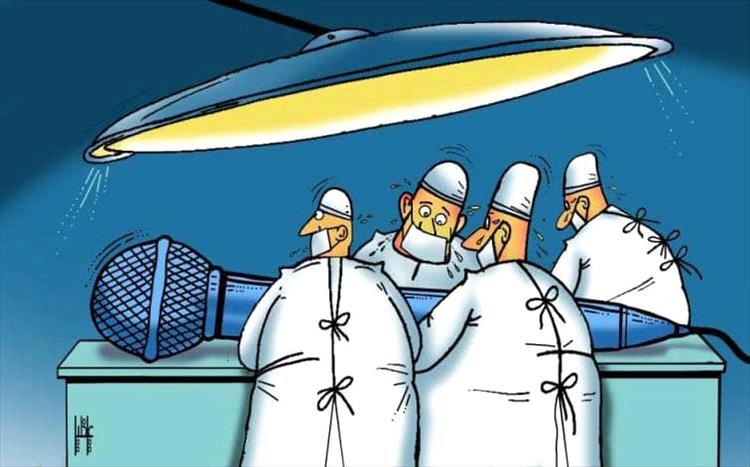 الكاريكاتير يعبر عن أزمة الكلمة والصوت الحر في بعض المجتمعات ويصورها ككيان ضعيف يحتاج إلى تدخل جراحي، وسط أجواء من التوجس والقلق