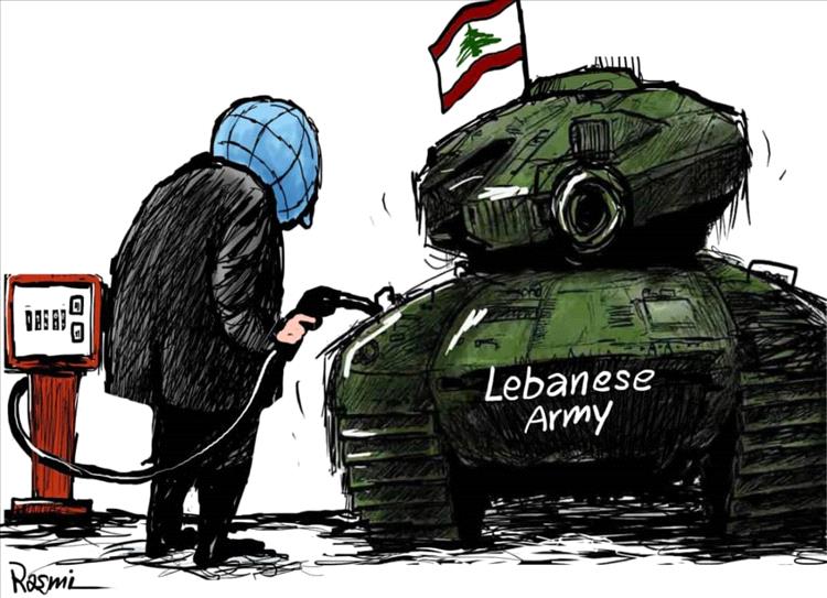 يجسد الكاريكاتير اعتماد الجيش اللبناني الكلي على الدعم الدولي نتيجة الأزمة الاقتصادية الطاحنة.