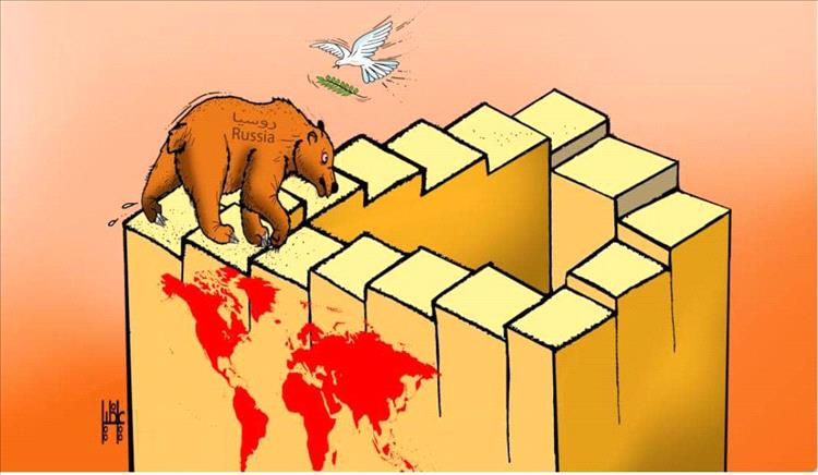 كاريكاتير يصور روسيا (الدب) عالقة في حلقة مفرغة من الصراع والحروب التي لا تنتهي، وسط عالم يغرق في الدماء وغياب للسلام.