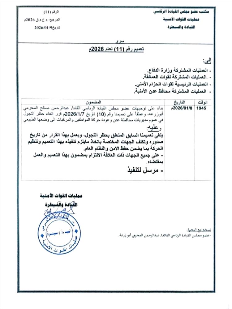 وأوضح التعميم الصادر اليوم إلغاء العمل بالقرار السابق رقم (10) لعام 2026م الخاص بحظر التجوال، مع توجيه الجهات المختصة والمعنية بمباشرة مهامها في تنظيم الحركة بما يضمن تعزيز الأمن والنظام العام وتسهيل تنقلات المواطنين.