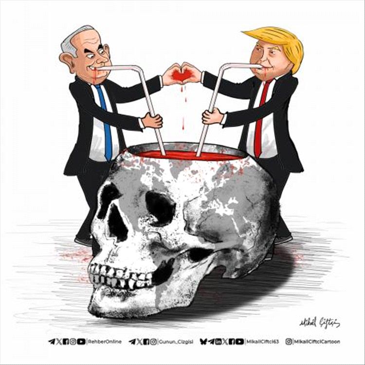 الكاريكاتير يظهر نتنياهو وترامب يشربان الدم من جمجمة بشرية عبر قصبات، في إشارة رمزية لتحالفهما القائم على حساب حياة الشعوب والضحايا.