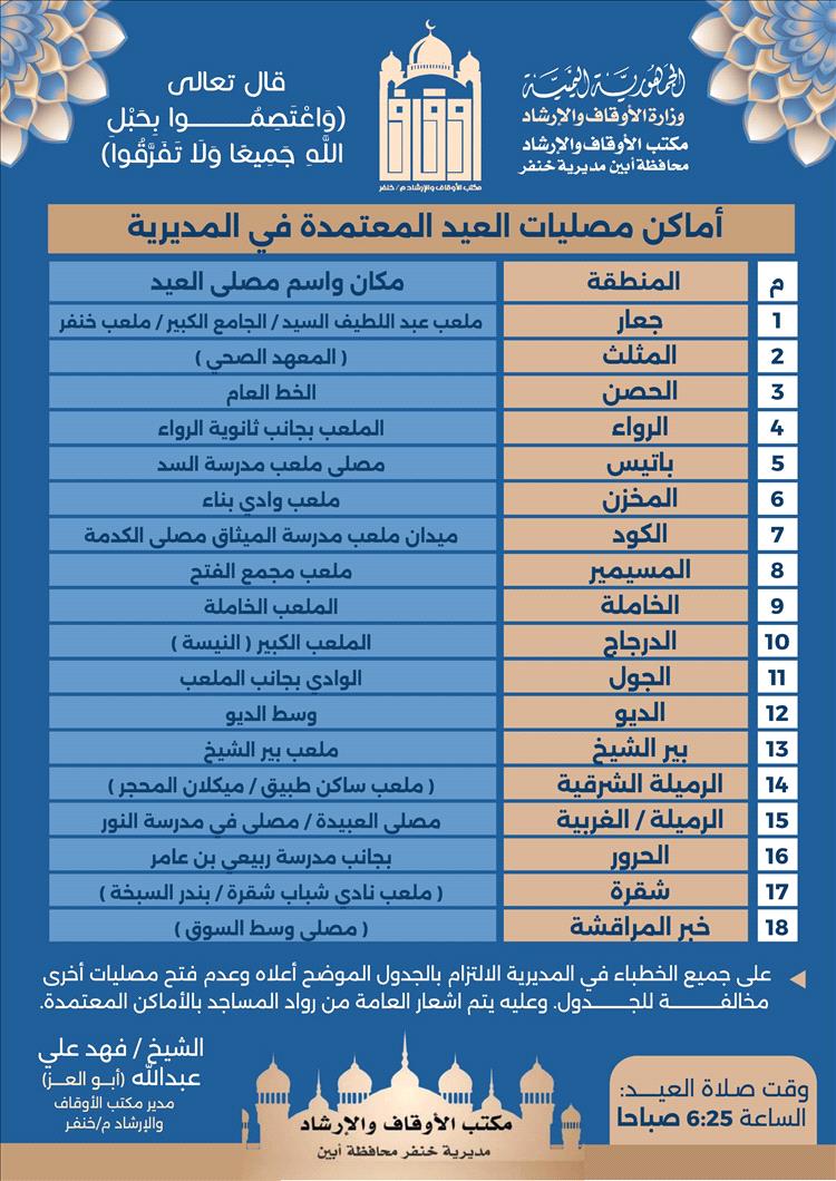 أعلن مكتب الأوقاف والإرشاد بمديرية خنفر محافظة أبين ب عن اعتماد قائمة معتمدة بالمصليات المخصصة لإقامة صلاة عيد الفطر المبارك وذلك ضمن الترتيبات التنظيمية الهادفة إلى تسهيل أداء الشعيرة في أجواء آمنة ومنظمة بمختلف مناطق المديرية.