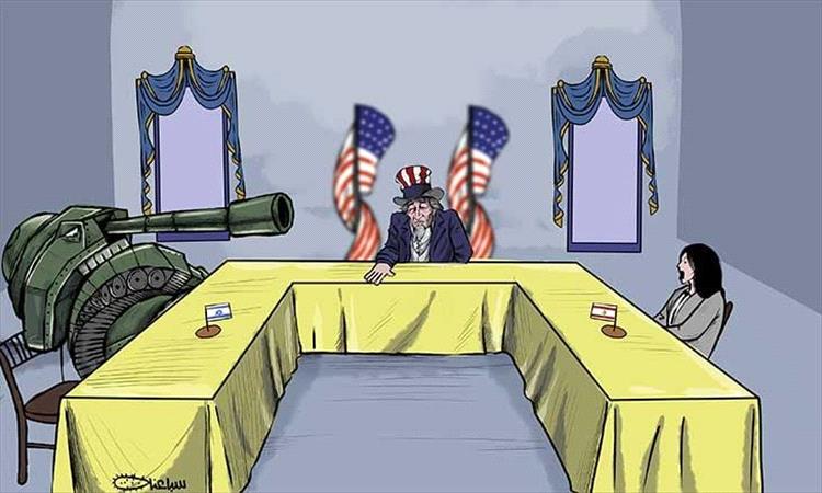يوضح الكاريكاتير زيف المفاوضات السياسية التي تجري برعاية أمريكية حيث تجلس الأطراف المتنازعة على طاولة الحوار بينما توجه الدبابات فوهاتها نحو الحضور مما يؤكد أن لغة السلاح والتهديد العسكري هي المحرك الفعلي خلف الكواليس.