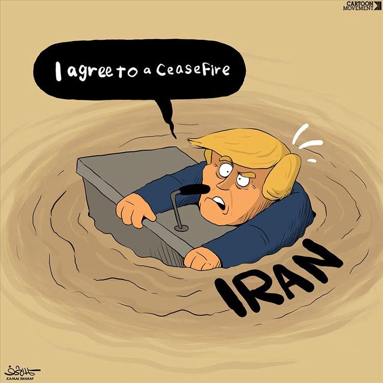 يصور الكاريكاتير الرئيس الأمريكي دونالد ترامب غارقاً في رمال متحركة كُتب عليها "إيران"، بينما يصرخ بالموافقة على وقف إطلاق النار. يجسد الرسم المأزق السياسي والعسكري الذي يواجهه القادة عند التورط في صراعات إقليمية معقدة.