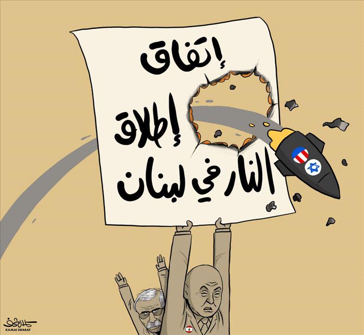 يُظهر الكاريكاتير مسؤولين لبنانيين يرفعون ورقة "اتفاق وقف إطلاق النار"، بينما يخترقها صاروخ يحمل شعارات أمريكية وإسرائيلية. يعبر الرسم عن هشاشة الاتفاقات السياسية وتواصل الاعتداءات العسكرية التي تضرب بعرض الحائط كل المساعي الدبلوماسية لوقف الحرب.