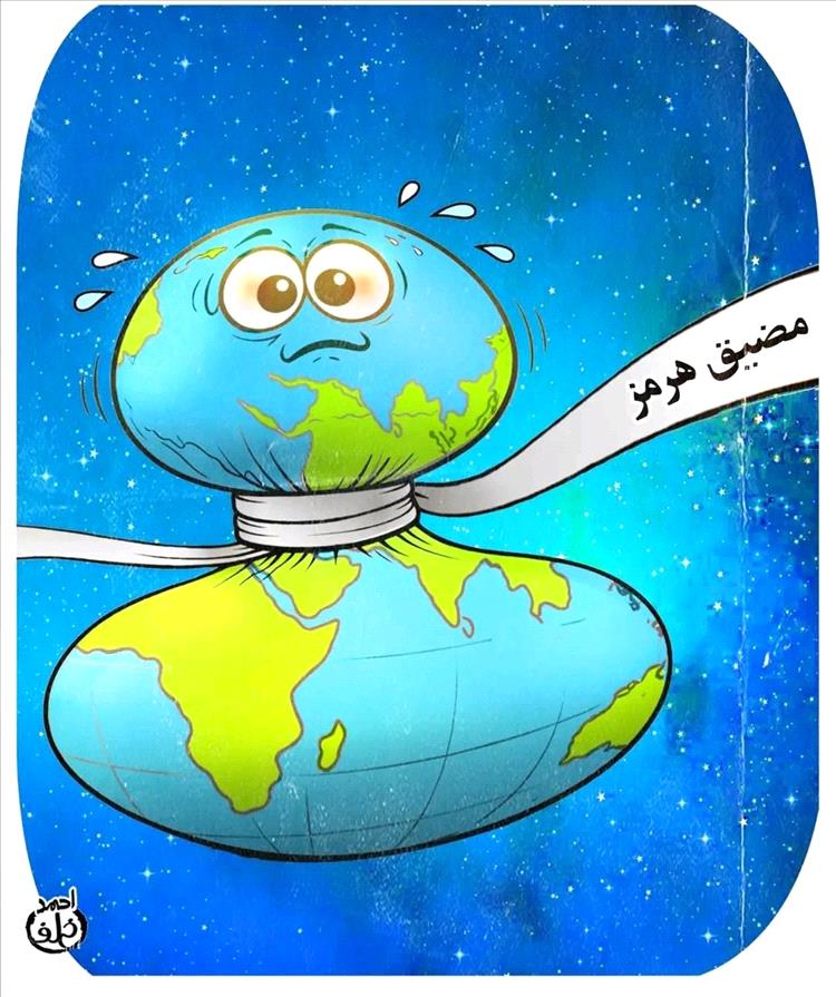 يصور الكاريكاتير الكرة الأرضية ككائن حي يختنق، حيث يلتف حبل "مضيق هرمز" حول عنقها، مما يرمز إلى الأهمية الجيوسياسية والاقتصادية الفائقة لهذا الممر المائي. يعبر المشهد عن القلق العالمي من تأثير أي توترات في المضيق على إمدادات الطاقة والاقتصاد الدولي.