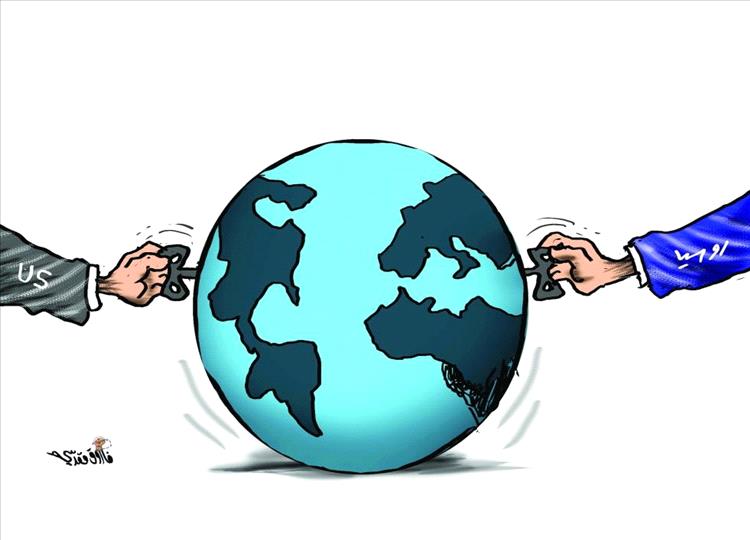 رسم كاريكاتيري يجسد الصراع الدولي بين القوتين العظميين، الولايات المتحدة وروسيا، حيث ترمز اليدان اللتان تمسكان بمفاتيح التحكم في الكرة الأرضية إلى محاولات كل طرف فرض نفوذه وهيمنته على المسار العالمي.