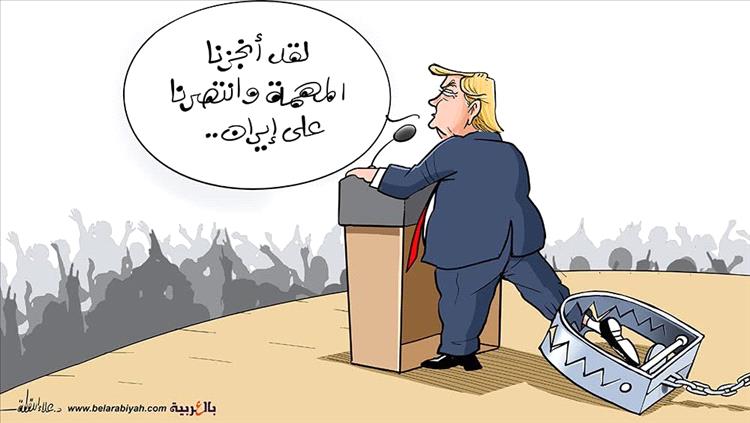 يظهر الكاريكاتير ترامب يخطب بزهو مدعياً الانتصار على إيران، بينما تُطبق "مصيدة" حديدية على قدمه. يرمز الرسم إلى أن الشعارات الرنانة والإنجازات الوهمية تخفي خلفها غرقاً في مستنقع سياسي وفخاً استراتيجياً نصب له بإحكام.